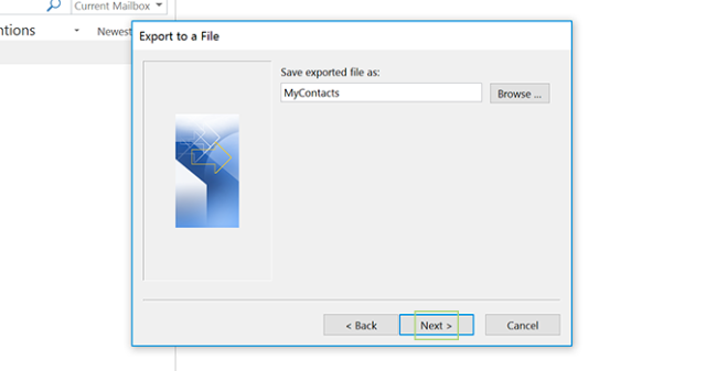 8. Name the file, or click Browse to find an existing export file (if you’ve done this previously) and then click Next.