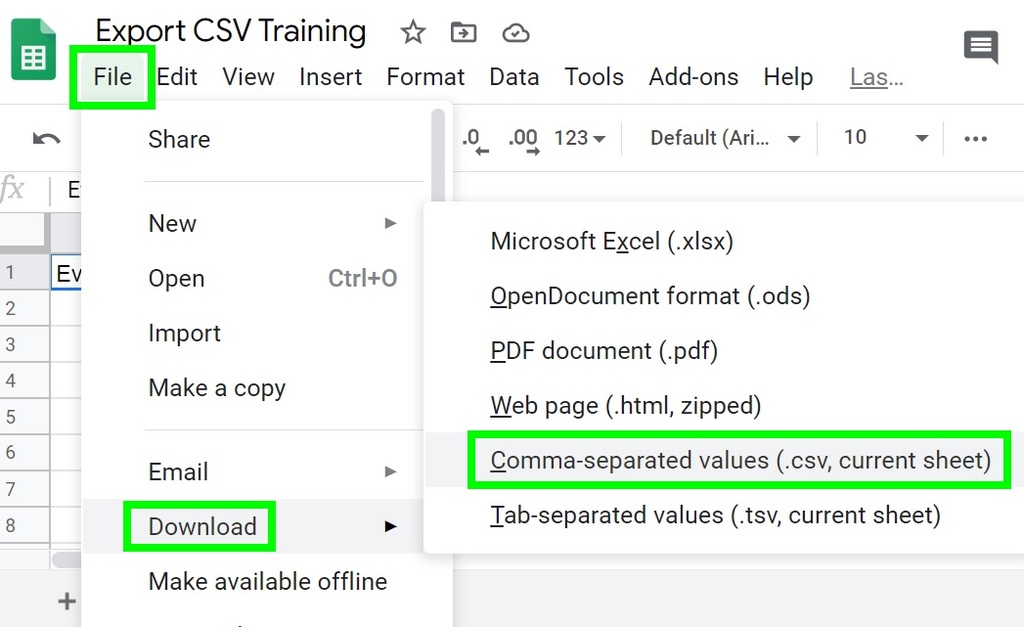 After following the steps above, the data from the selected tab of your Google spreadsheet will be exported into a CSV file that will download directly to your computer's "Downloads" folder.