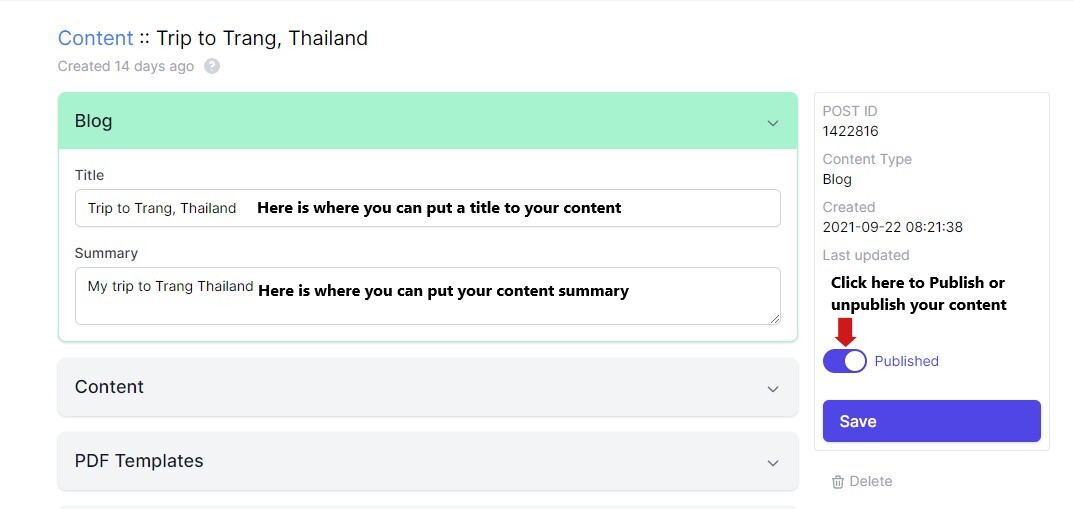 Here is an explanation about what each panel in the blog means, how to publish and unpublish.